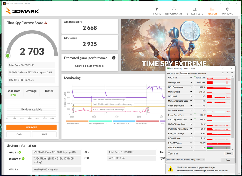 Так как подготовка материала была проведена до официального анонса, то утилита GPU-Z не смогла показать все параметры графического адаптера, но ключевые моменты указаны верно – это количество вычислительных ядер, их тактовая частота, объём и тип видеопамяти, как и её частота. Внутри установлен Max-Q вариант мобильной видеокарты RTX 3080 – память функционирует на эффективной частоте 12000 МГц.