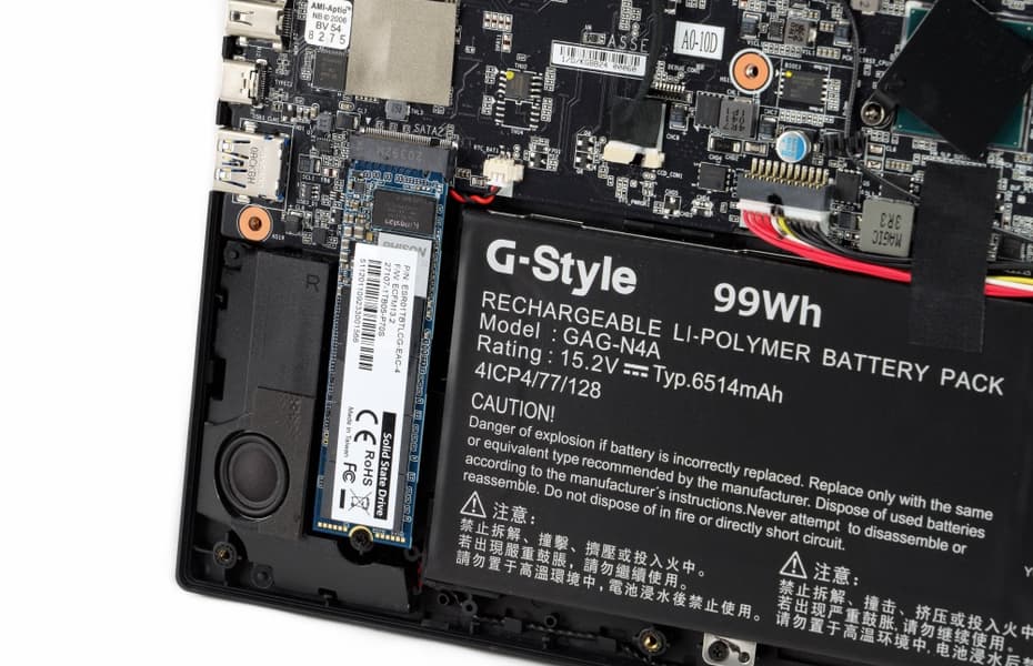 Оперативная память представлена двумя модулями SO-DIMM DDR4 объёмом 32 Гбайт каждый. Они могут функционировать как на частоте 3200 МГц, так и на частоте 2933 МГц. Рядом с модулями ОЗУ установлен модуль беспроводной связи Intel AX200NGW. Чуть правее нашлось место для одного из пары M.2 NVMe PCIe SSD-накопителей.