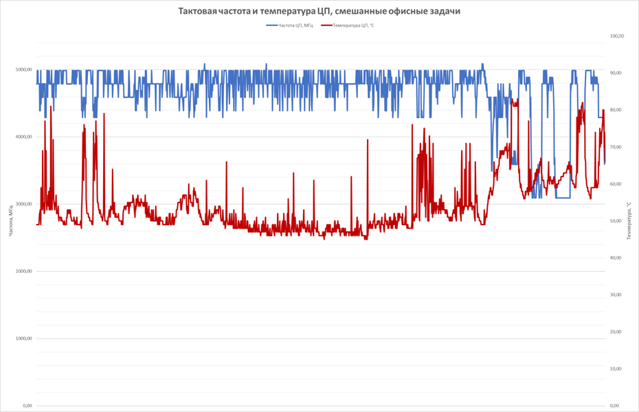 А теперь не менее интересная информация – о температурах и тактовых частотах процессора и видеокарты. Начнём с процессора. В офисном режиме (браузер, работа с документами и таблицами, воспроизведение видео, даже немного 3D и архивирования) тактовая частота процессора держалась на отметке свыше 4 ГГц, а снижалась лишь при полных нагрузках, но не менее, чем до 3 ГГц. Температура сильно зависит от нагрузки и частоты, но до 85 градусов она так и не поднялась.
