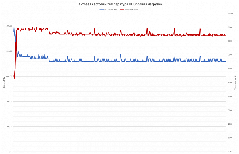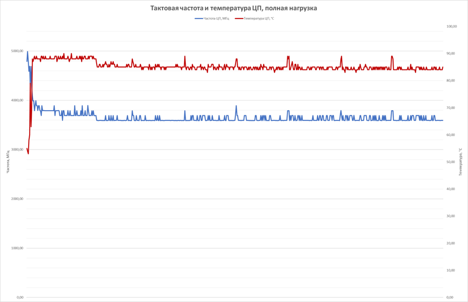 Если же нагрузить процессор, к примеру, визуализацией изображения в blender, то частота будет колебаться в районе 3,5 ГГц, а температура сначала поднимется практически до 90 градусов, но затем опустится (вспоминаем ограничения по энергопотреблению) примерно до 85 градусов.