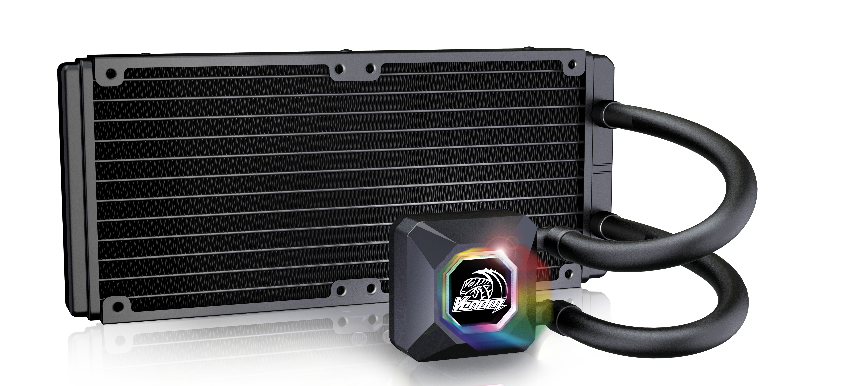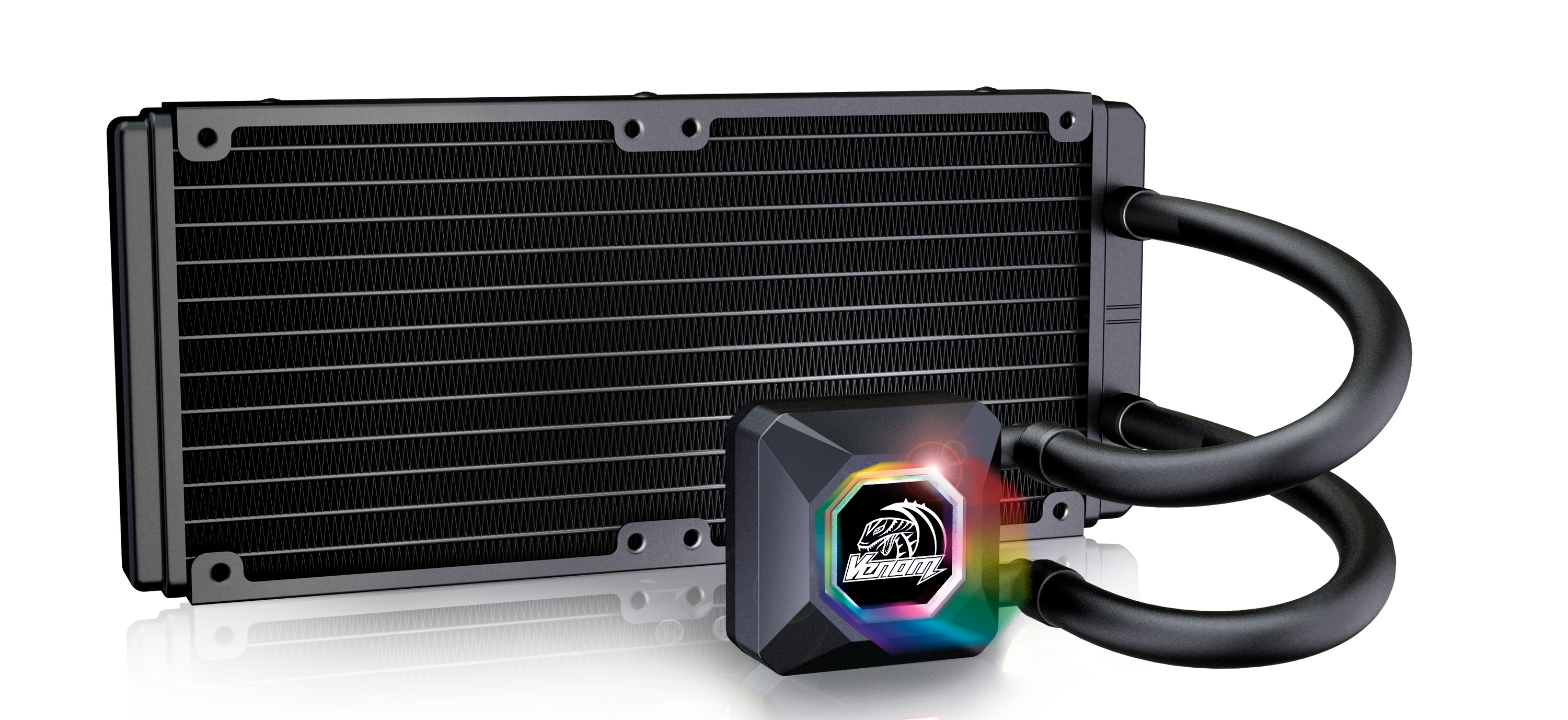 Одна из последних процессорных систем жидкостного охлаждения Akasa – Venom R20. Это хорошая, добротная СЖО с тихой помпой и алюминиевым радиатором, которая не показывает ничего сверхъестественного, но очень достойно справляется со своими задачами. Тем не менее, и здесь нашлось место (на крышке водоблока) ярким LED с поддержкой таких решений, как Asus Aura, ASRock Polychrome, Gigabyte RGB Fusion и MSI Mystic Light.