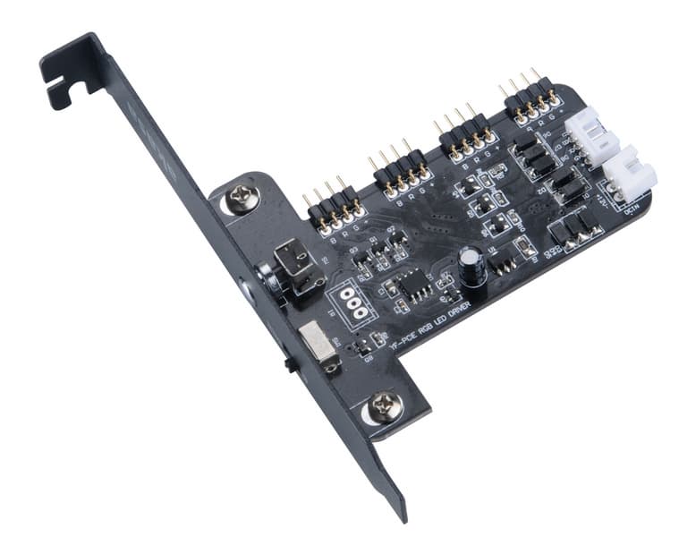Перед вами контроллер, который может быть использован для управления и системой охлаждения, и системой подсветки одновременно. Он позволяет подсоединить до шести PWM-вентиляторов и до четырех устройств с адресуемыми светодиодами. В комплект к контроллеру входят все необходимые кабели (Molex, PWM, разветвитель для LED) и пульт для дистанционного управления скоростью мерцания подсветки, яркостью свечения и сменой режимов. Сам контроллер очень компактный и легко поместится в любой корпус.