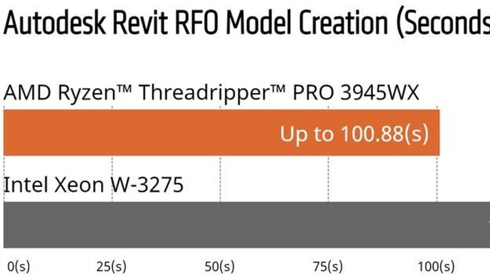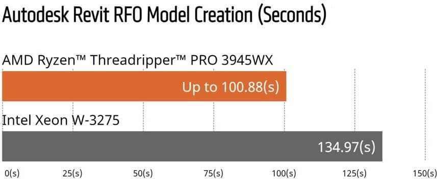 1 По результатам тестирования, проведенного 8 июня 2020 г. в тестовой лаборатории AMD с использованием теста Autodesk Revit RFO v3.2 2020 для сравнения производительности эталонной системы с процессором AMD Ryzen Threadripper PRO 3945WX и системы с процессором Intel Xeon W-3275. Результаты могут варьироваться. CPP-70