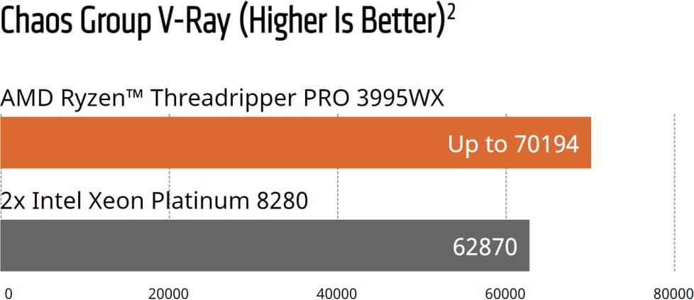 2 По результатам тестирования, проведенного в тестовой лаборатории AMD 8 июня 2020 г. с использованием теста Chaos Group V-Ray. Тестирование производительности проведено для эталонной системы с процессором AMD Ryzen Threadripper PRO 3995WX и системы с двумя процессорами Intel Xeon Platinum 8280. Результаты могут варьироваться. CPP-32