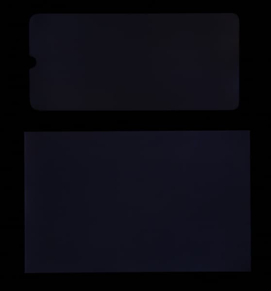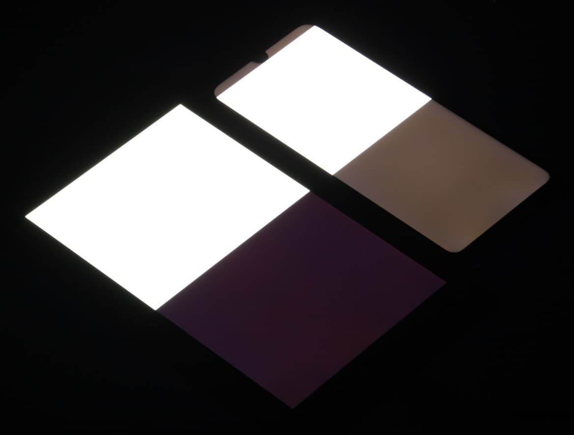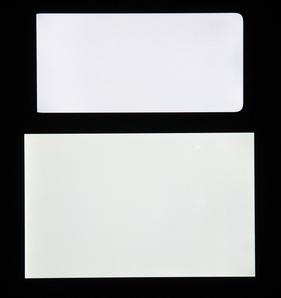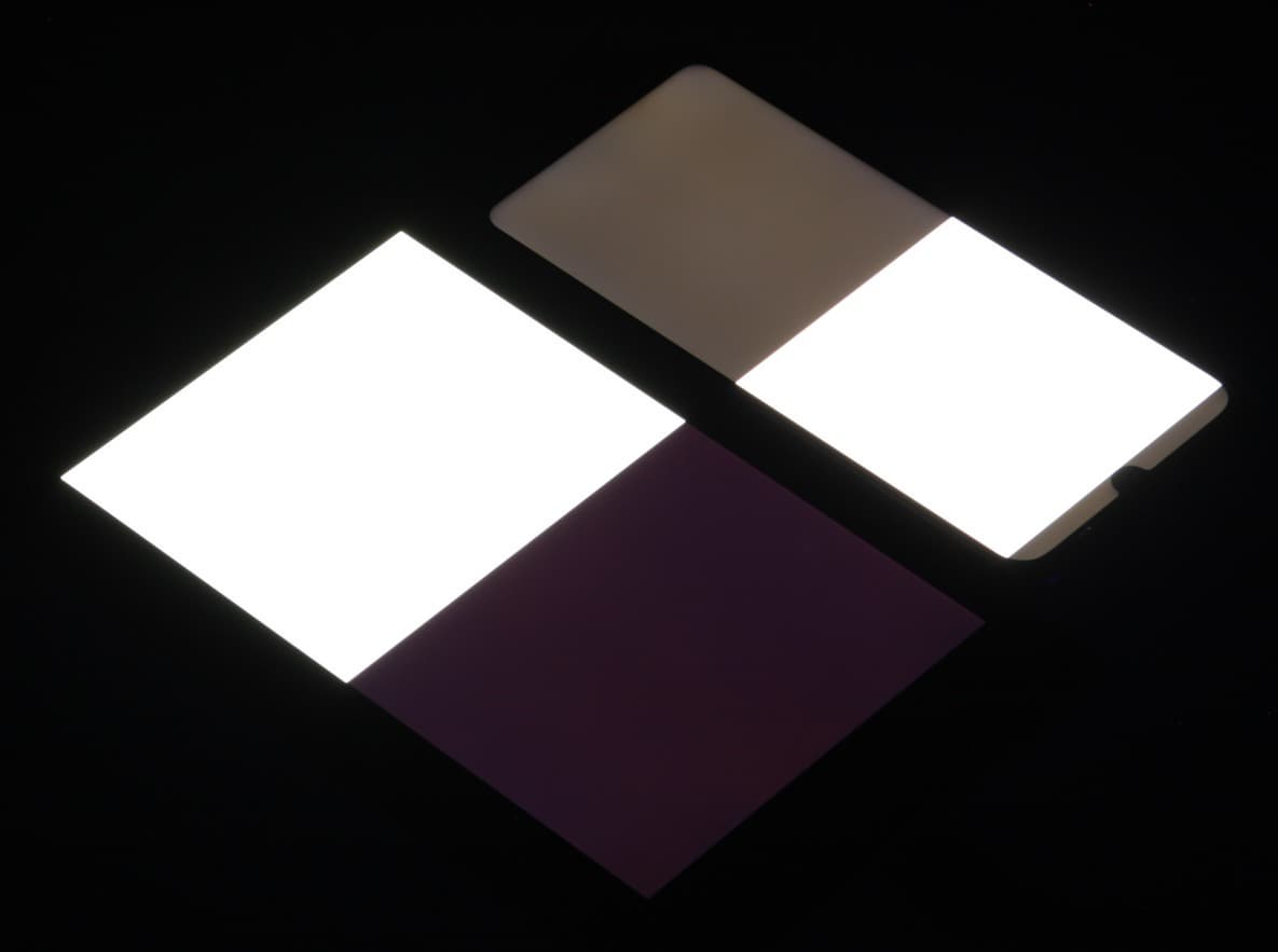 Черное поле при отклонении по диагонали сильно высветляется и приобретает красноватый оттенок. Фотографии ниже это демонстрируют (яркость белых участков в перпендикулярном плоскости экранов направлении одинаковая!):