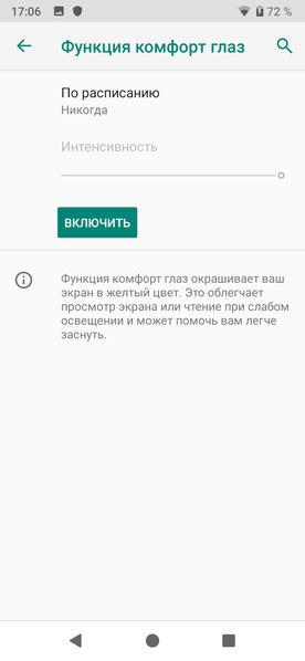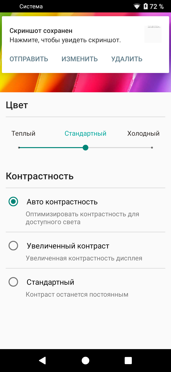 В настройках экрана можно выбрать один из трех профилей (принципиальной разницы между ними нет) и в случае первого профиля установить один из трех вариантов коррекции цветовой температуры. Отдельной настройкой можно уменьшить интенсивность синей компоненты: