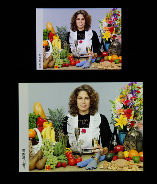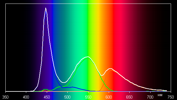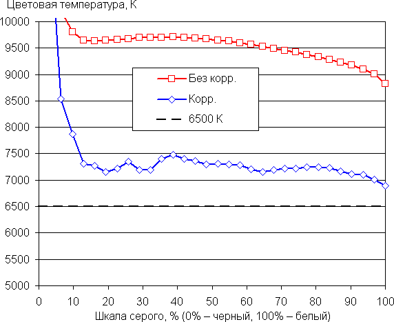 По умолчанию баланс оттенков на шкале компромиссный, так как цветовая температура существенно выше стандартных 6500 К, но отклонение от спектра абсолютно черного тела (ΔE) на большей части шкалы серого ниже 3, что даже для профессионального устройства считается отличным показателем. При этом цветовая температура и ΔE мало изменяются от оттенка к оттенку — это положительно сказывается на визуальной оценке цветового баланса. (Самые темные области шкалы серого можно не учитывать, так как там баланс цветов не имеет большого значения, да и погрешность измерений цветовых характеристик на низкой яркости большая.)