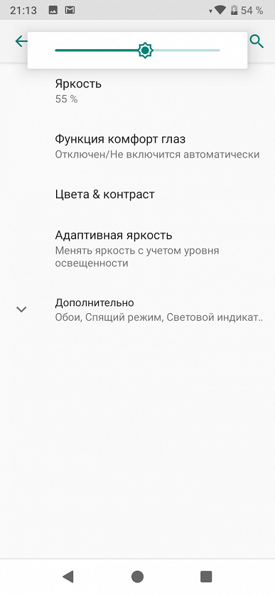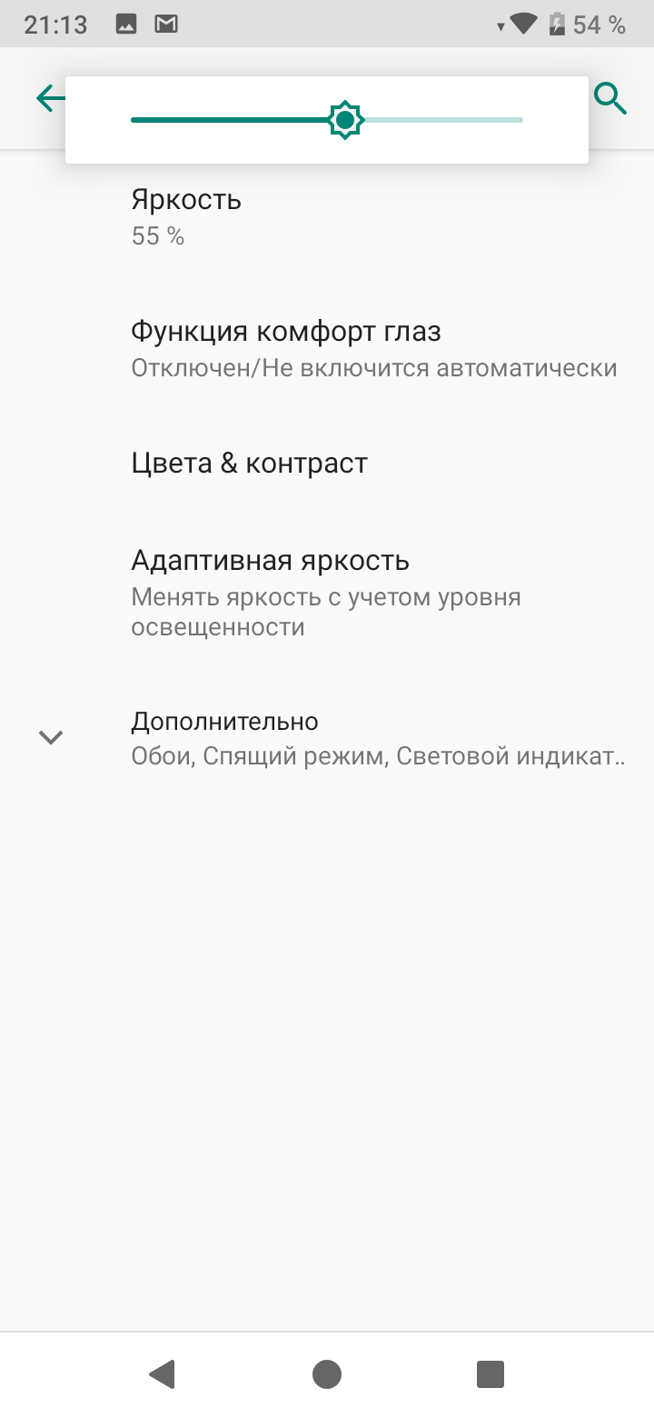 При ручном управлении яркостью и при выводе белого поля во весь экран максимальное значение яркости составило около 450 кд/м², минимальное — 4 кд/м². Максимальная яркость высокая, и, учитывая отличные антибликовые свойства, читаемость экрана даже в солнечный день вне помещения должна быть на приемлемом уровне. В полной темноте яркость можно понизить до комфортного значения. В наличии автоматическая регулировка яркости по датчику освещенности (он находится правее объектива фронтальной камеры на краю передней панели). В автоматическом режиме при изменении внешних условий освещенности яркость экрана как повышается, так и понижается. Работа этой функции зависит от положения ползунка регулировки яркости: им пользователь может попытаться выставить желаемый уровень яркости в текущих условиях. Если не вмешиваться, то в полной темноте функция автояркости уменьшает яркость до 6 кд/м² (низковато), в условиях освещенного искусственным светом офиса (примерно 550 лк) устанавливает на 220 кд/м² (нормально), в очень ярком окружении (соответствует освещению ясным днем вне помещения, но без прямого солнечного света — 20000 лк или немного больше) повышает до 450 кд/м² (до максимума, так и нужно). Мы немного увеличили яркость в полной темноте и получили: в темноте 10 кд/м², в условиях освещенного искусственным светом офиса — 280 кд/м², в очень ярком окружении — 450 кд/м², такой результат нас устроил. Получается, что функция автоподстройки яркости работает адекватно и позволяет пользователю настраивать свою работу под индивидуальные требования. На любом уровне яркости значимая модуляция подсветки отсутствует, поэтому нет и никакого мерцания экрана.