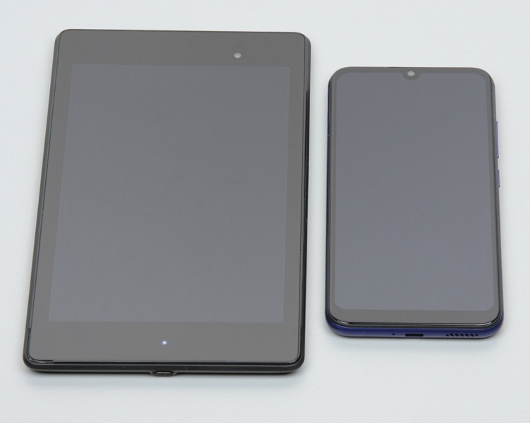 Лицевая поверхность экрана выполнена в виде стеклянной пластины с зеркально-гладкой поверхностью, устойчивой к появлению царапин. Судя по отражению объектов, антибликовые свойства экрана не хуже, чем у экрана Google Nexus 7 (2013) (далее просто Nexus 7). Для наглядности приведем фотографию, на которой в выключенных экранах отражается белая поверхность (слева — Nexus 7, справа — BQ 6040L Magic, далее их можно различать по размеру):