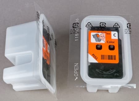 - три цветных (водорастворимые чернила на основе красителя — голубые Cyan, пурпурные Magenta и желтые Yellow), объем по 70 мл, рассчитаны на печать 7000 страниц.