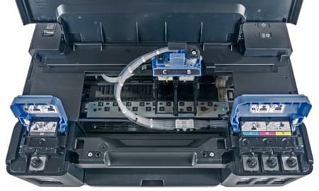 Ёмкости расположены двумя группами: слева одна большая для черных чернил, справа - три поменьше для цветных. Их горловины находятся под синими откидными крышечками и снабжены резиновыми пробками.