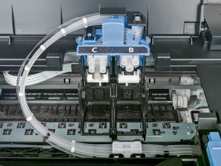 Несмотря на сходство печатающих головок линейки PIXMA G и картриджей E464, доступ к месту их установки разный. Если у E464 картриджи вставляются спереди, что очень неудобно, то держатель головок (каретка) в PIXMA G становится легко доступным после поднятия верхней крышки.