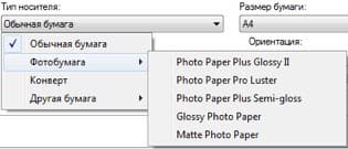 Выбор типов носителей прежний: бумага, фотобумага, конверт. А вот сортов фотобумаги уже не два, а пять, вполне конкретных (естественно, подразумевается ассортимент, предлагаемый самой компанией Canon), среди которых есть и глянцевые, и полуглянцевый, и матовый:
