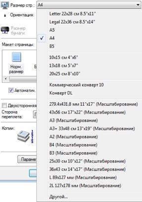 На закладке «Страница» есть определение размера страницы, где имеются и такие форматы, как А3, А3+ и даже А2, но они относятся к формату, заданному для страниц выводимого на печать документа, и потому помечены словом «Масштабирование» — то есть произойдет автоматическое изменение масштаба вывода для размещения на формате листа, заданного в имеющейся чуть ниже графе «Размер бумаги».