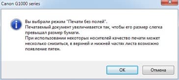 При задании режима печати без полей возникает предупреждение: