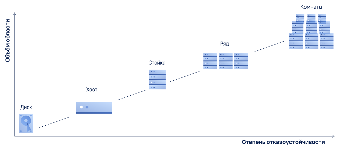 Высокая доступность системы обеспечивается за счет гибких настроек, среди которых можно выделить области отказа. Это те элементы системы, которые могут выйти из строя без потери данных и утраты системой работоспособности.