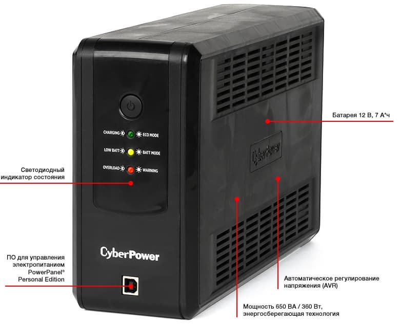 Традиционно для CyberPower, корпус ИБП выполнен из качественного пластика и для удобства пользователя реализована возможность управления звуковым сигналом и светодиодная индикация. Управление ИБП и мониторинг состояния сети и батарей могут быть настроены через фирменное программное обеспечение PowerPanel®Personal Edition.