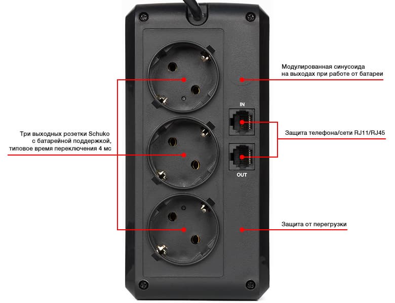 Во всех моделях серии реализована возможность подключения по USB и защита канала передачи данные RJ11/RJ45 с гарантировано высокой скоростью работы. Все выходные разъемы обеспечивают питание от батареи, к моделям с евро розетками можно подключить до 3 устройств, к моделям с компьютерными розетками – до 4 устройств.
