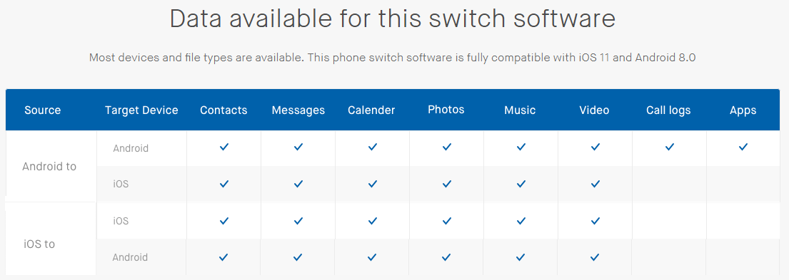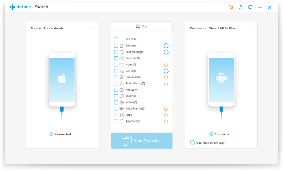 Итак, dr.fone Switch предназначен для безболезненного переезда с одного смартфона на другой — с Android на iOS или наоборот. Приложение обладает простейшим интерфейсом и позволяет перенести контакты, SMS, календари, заметки, закладки браузера, историю звонков, фотографии, музыку и видео, а если переезд осуществляется между Android-устройствами, то копируются еще и приложения.