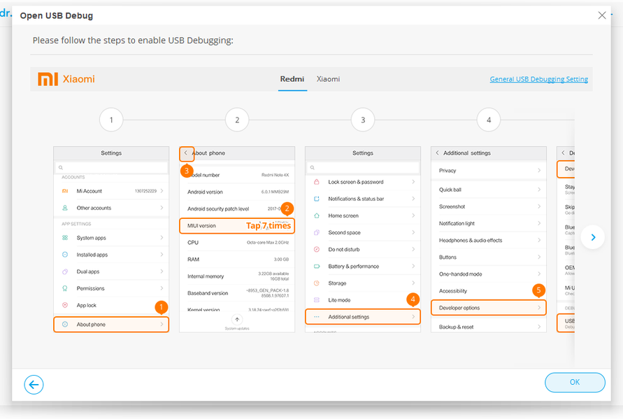 В случае с iPhone приложение закрывает открытый iTunes, а для Android настойчиво просит включить режим разработчика и активировать отладку и установку через USB — и тут же показывает на картинках, как добраться до нужного пункта настроек.