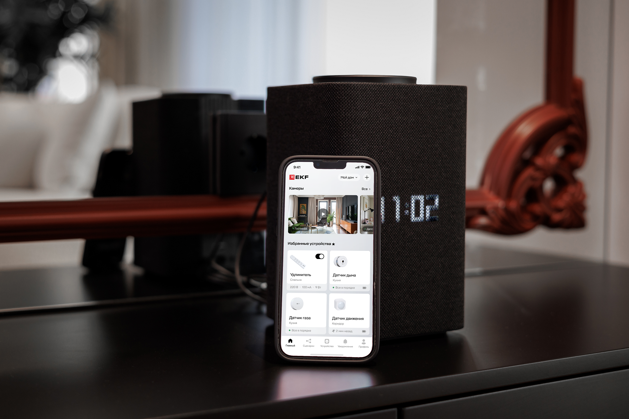 Один из наглядных кейсов — шоурум в жилом комплексе NOVA (проект группы «Самолёт»). Там на примере реальной квартиры показано, как работает система умного дома EKF: на ее базе реализованы управление светом, шторами, розетками, подогревом полов, а также мониторинг климата и безопасности (температура, влажность, открытие дверей).