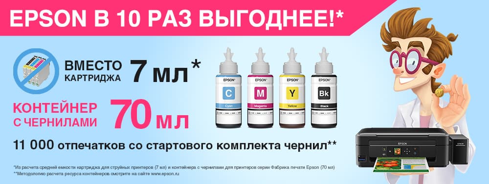 Чернила для устройств серии «Фабрика печати Epson» поставляются в контейнерах объемом по 70 и 140 мл. Это в десять и более раз больше, чем в обычном картридже для струйного домашнего принтера Epson. Набора чернил, который идет в комплекте поставки к «Фабрике печати», хватит на 6 500 цветных и