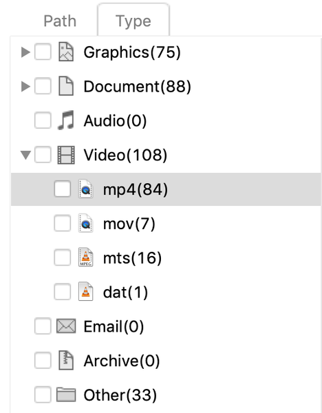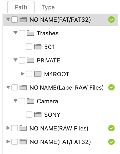 На экране с результатами есть два представления списка найденных файлов: в дереве папок или по типу контента (изображения, документы, видео и т. д.). Деревьев при этом несколько: похоже, в одни попадает то, что видно в файловой системе, в другие — то, что уже удалено. Да, почему-то среди результатов поиска на SD-карте показывались и стертые, и существующие файлы. По ходу дела выяснилось, что камера (Sony a6300) при съёмке видео делает фотографии-миниатюры, видимо, чтобы использовать их в своё интерфейсе показе списка видеороликов.