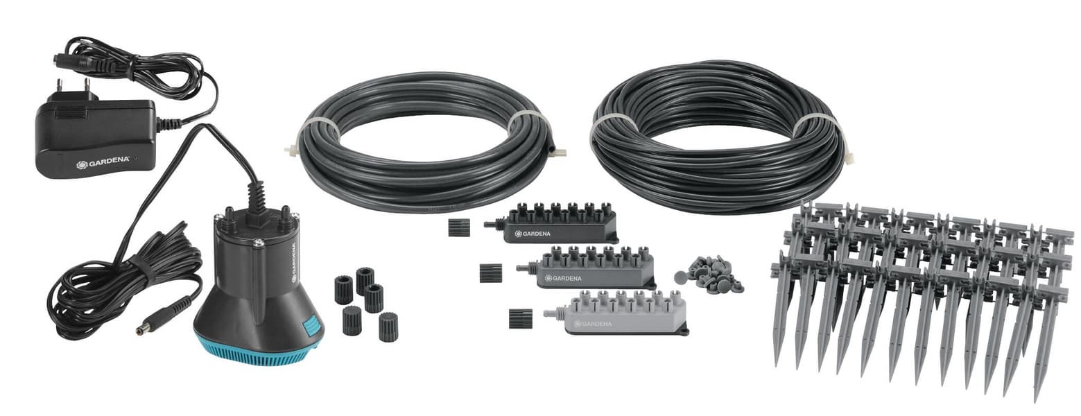 Нежный полив обеспечивает мастер-блок 1000, который очищает до 1000 литров воды в час и снижает давление в системе до 1,5 бар. Базового комплекта хватит для полива 7 горшечных растений и 3 цветочных ящиков. В комплект входит 9 внутренних капельниц, пропускающие до 2 л/час, и 7 регулируемых капельниц, диапазон пропускания которых варьируется от 0 до 10 л/час. И чем аккуратнее и равномернее вы поливаете растения, тем лучше они будут цвести.
