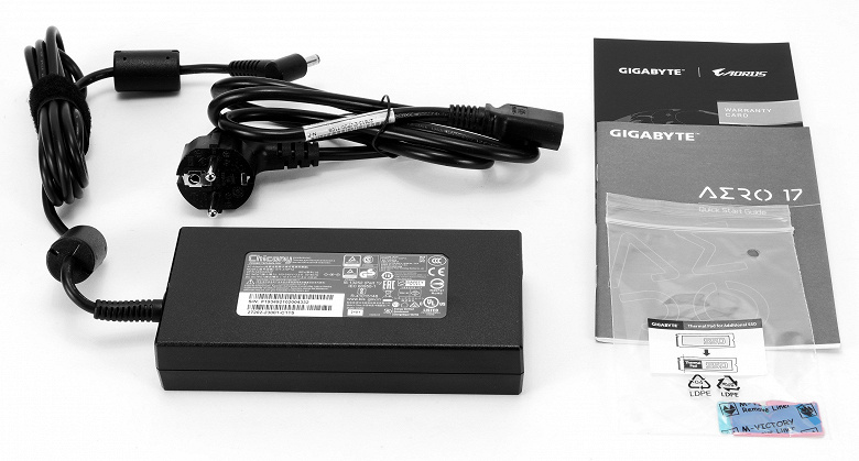 Комплект поставки уложен в отдельную коробку. Пользователь получает в своё распоряжение руководство пользователя, гарантийный талон, внешний блок питания A17-230P1A мощностью 230 В (произведён компанией Chicony, напряжение на выходе 19,5 В при номинальной силе тока 11,8 А) и термопрокладку для дополнительного SSD-накопителя, если вы надумаете таковой установить. Сделать, правда, быстро это не получится, так как два винта корпуса опломбированы, а повреждения этих пломб снимают гарантийные обязательства производителя перед вами. Поэтому для установки дополнительного накопителя или замены уже установленного или модулей оперативной памяти требуется обращаться в авторизованный СЦ, где поставят отметку в гарантийном талоне о произведённых изменениях.