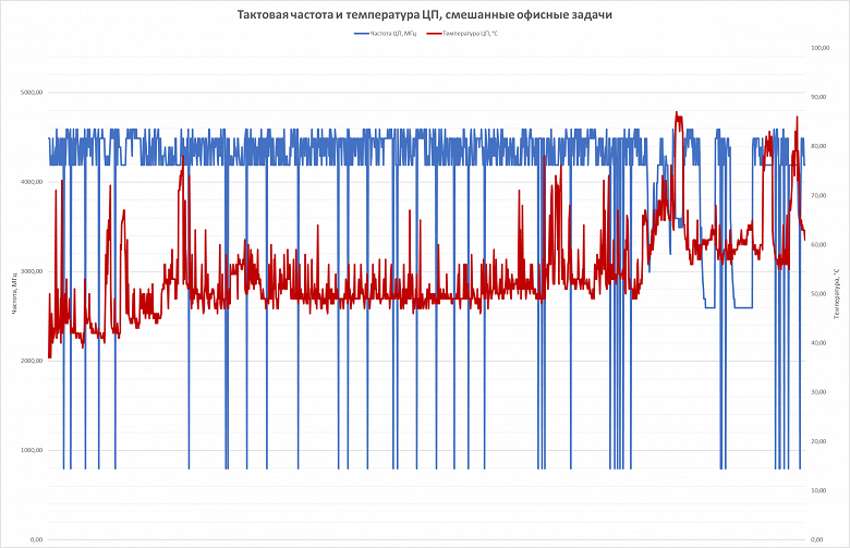 А теперь не менее интересная информация – о температурах и тактовых частотах процессора и видеокарты. Начнём с процессора. В офисном режиме (браузер, работа с документами и таблицами, воспроизведение видео, даже немного 3D и архивирования) тактовая частота процессора держалась на отметке свыше 4.2 ГГц, а снижалась лишь при полных нагрузках, но не менее, чем до 3 ГГц. Температура сильно зависит от нагрузки и частоты, но до 85 градусов при полной нагрузке она так и не поднялась. А при смешанной – и того колебалась в диапазоне 40-70 градусов.
