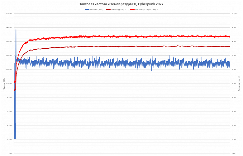 Температура графического процессора в играх в устоявшемся режиме составляет около 76-78 градусов (hotspot – в районе 84 градусов), а его тактовая частота колеблется в районе 1200 - 1400 МГц в зависимости от нагрузки.