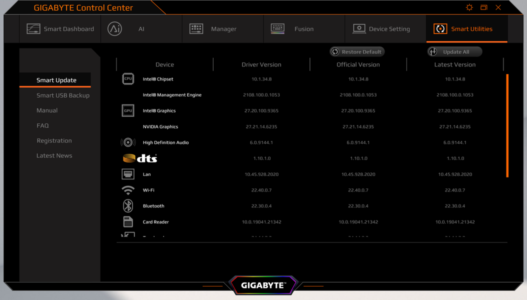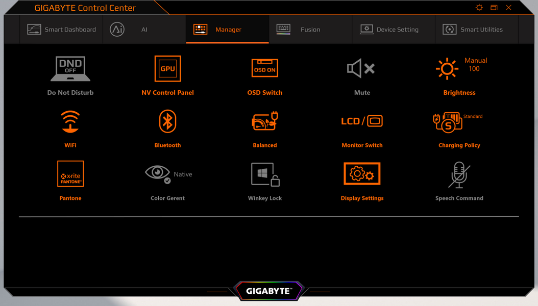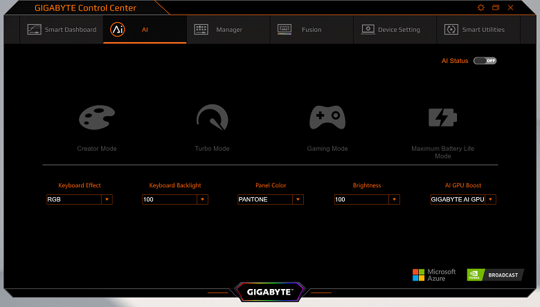 Среди предустановленных приложений безусловный интерес представляет GIGABYTE Control Center. Это простое в использовании ПО для управления большинством ключевых параметров ноутбука, а также для мониторинга состояния системы.