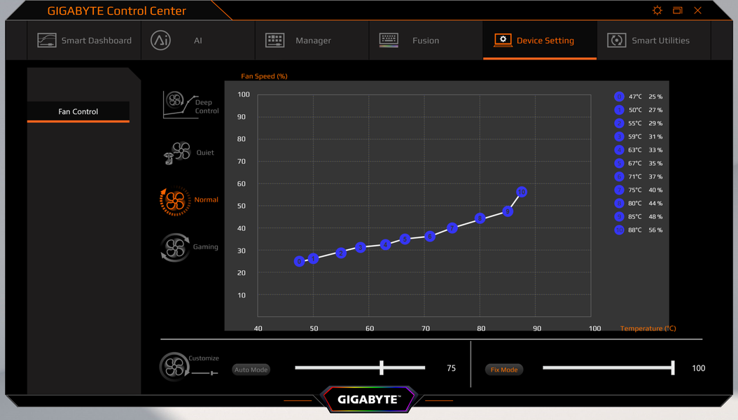 Встроенными средствами раздела Device Setting можно управлять скоростью вращения вентиляторов. Доступны несколько предустановленных профилей, также можно создать и активировать персональные профили на усмотрение пользователя.