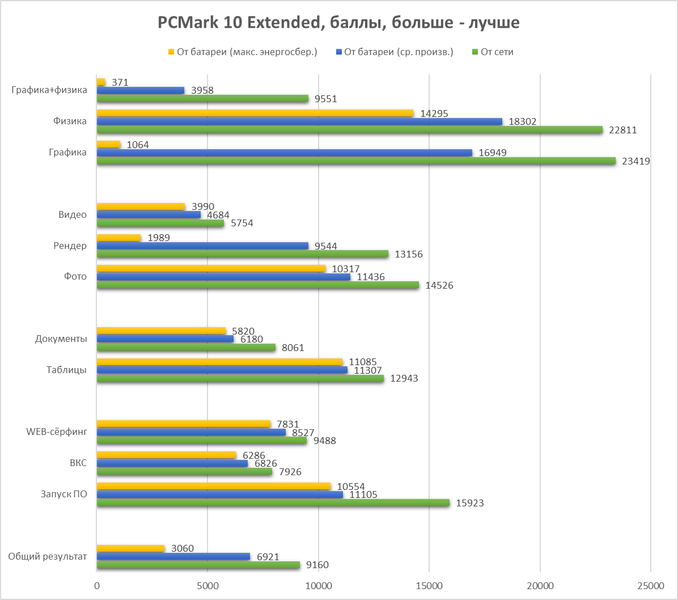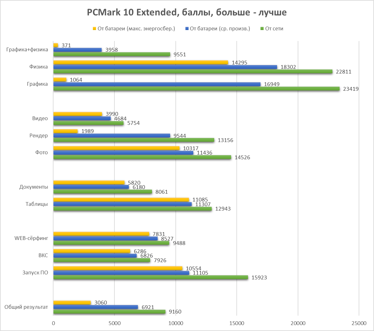 Начнём с PCMark 10 в режиме Extended – с полным набором тестов, включая визуализацию и 3D. В случае с ним, проверим три режима работы ноутбука – один от сети и два от батареи – один в режиме максимальной производительности, второй – максимальное энергосбережение. В последнем случае видеокарта снижает производительность до минимально возможной.
