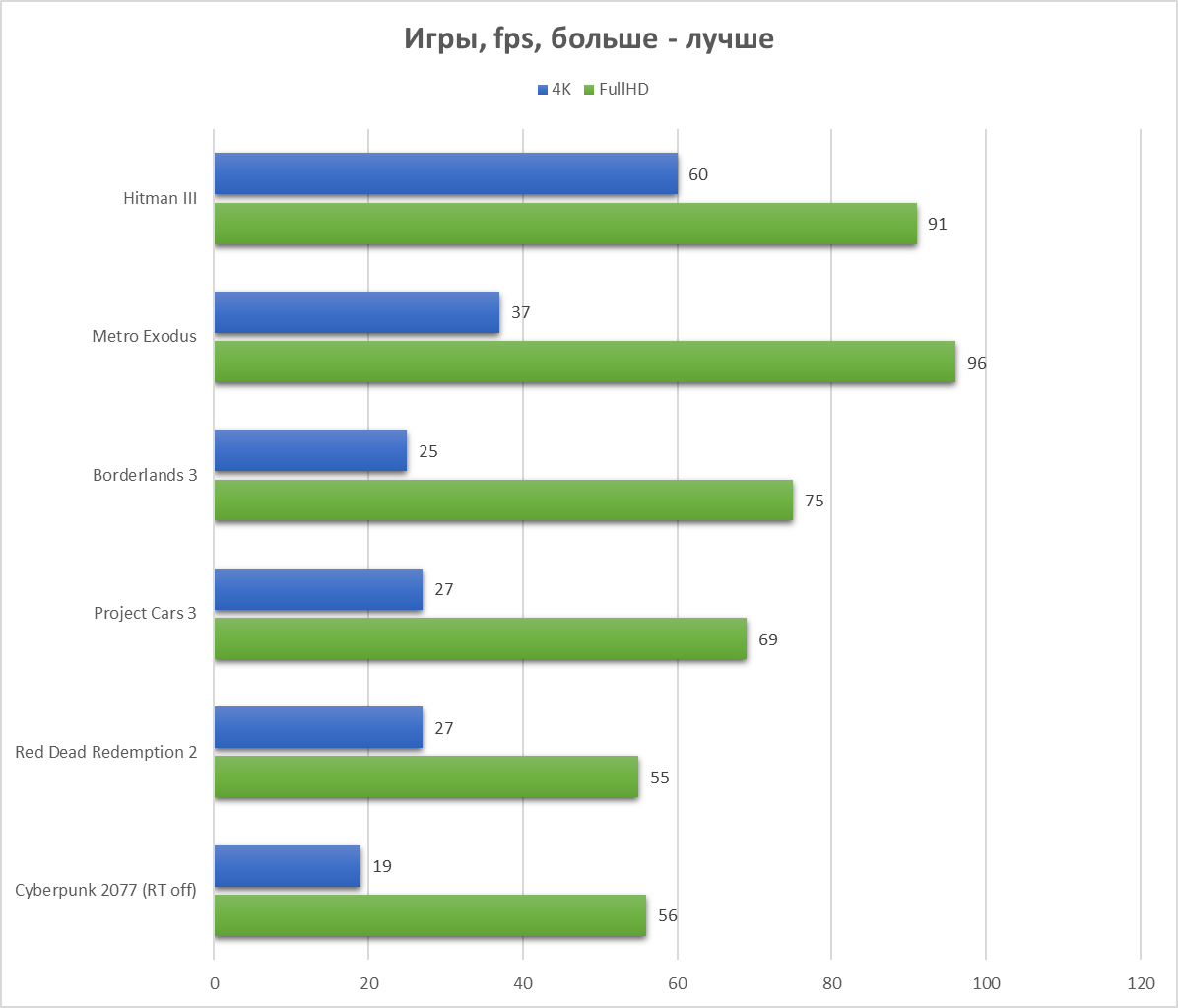 Не забудем и про развлечения в виде игр. Настройки выставим адекватно максимальные (то есть без 200% разрешения и подобных настроек, с которыми не все настольные видеокарты справляются), значения – средний показатель кадров в секунду.