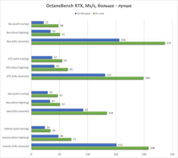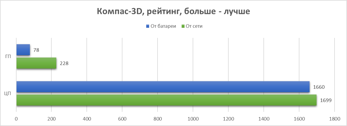 Теперь пробежимся по нескольким бенчмаркам профессионального ПО. Тестирование проведём также в двух режимах – при подключении к сети и от встроенного аккумулятора. Во всех случаях – чем выше результаты, тем выше рейтинг ноутбука.
