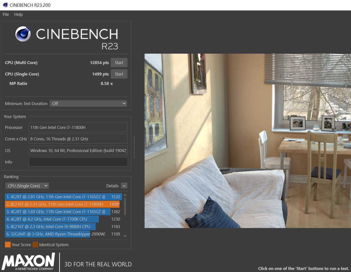 В бенчмарке Cinebench R23 процессор показал результат 12854 балла при использовании всех ядер и 1499 баллов – в сценарии для одного ядра.