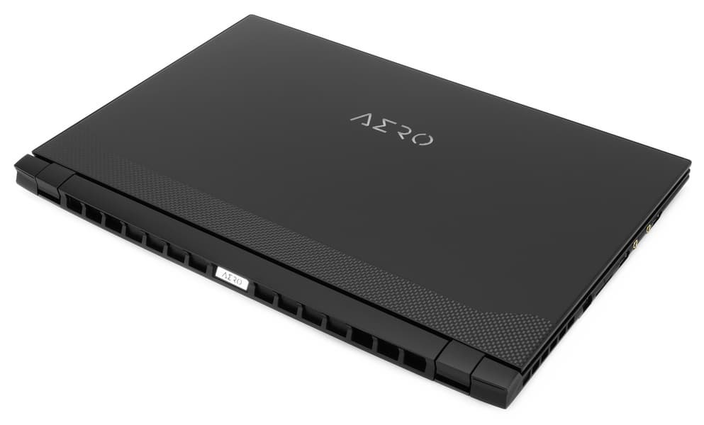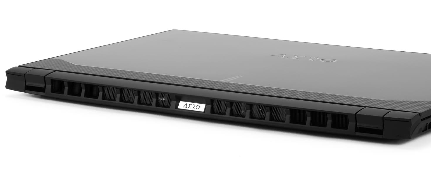 Корпус героя обзора выполнен полностью в чёрном цвете, за исключением логотипа AERO на внешней стороне крышки и клавиатуры, но об этом немного позже. Практически все элементы корпуса выполнены из металла, кроме некоторых вставок. Габариты модели составляют 396x270x21,5 мм при массе изделия около 2,5 кг. С учётом достаточно массивного и тяжёлого блока питания, каждый день возить на работу ноутбук можно, однако, предпочтительнее передвигаться на личном транспорте. Само-собой, парковка желательна в шаговой доступности от дома и офиса. Или же хорошая физическая подготовка, позволяющая регулярно носить с собой ноутбук с его блоком питания на большие расстояния без быстро приходящей усталости.