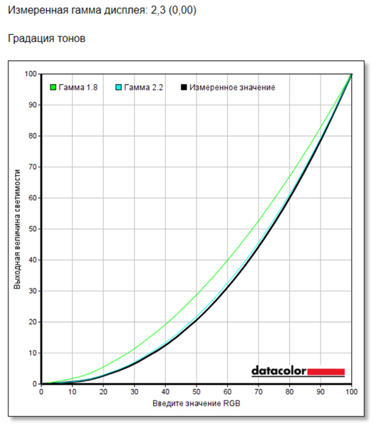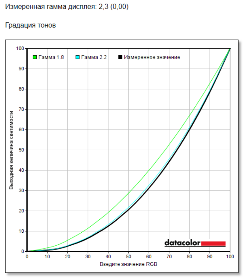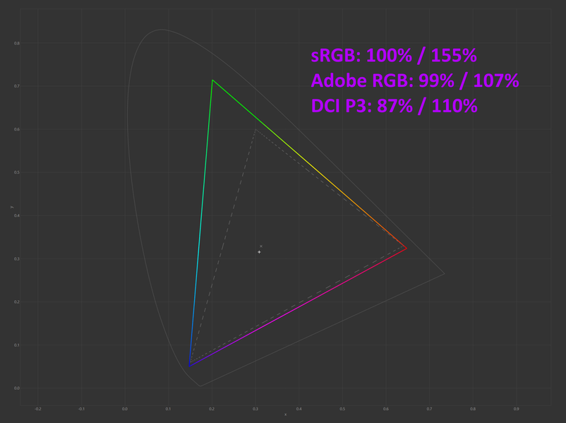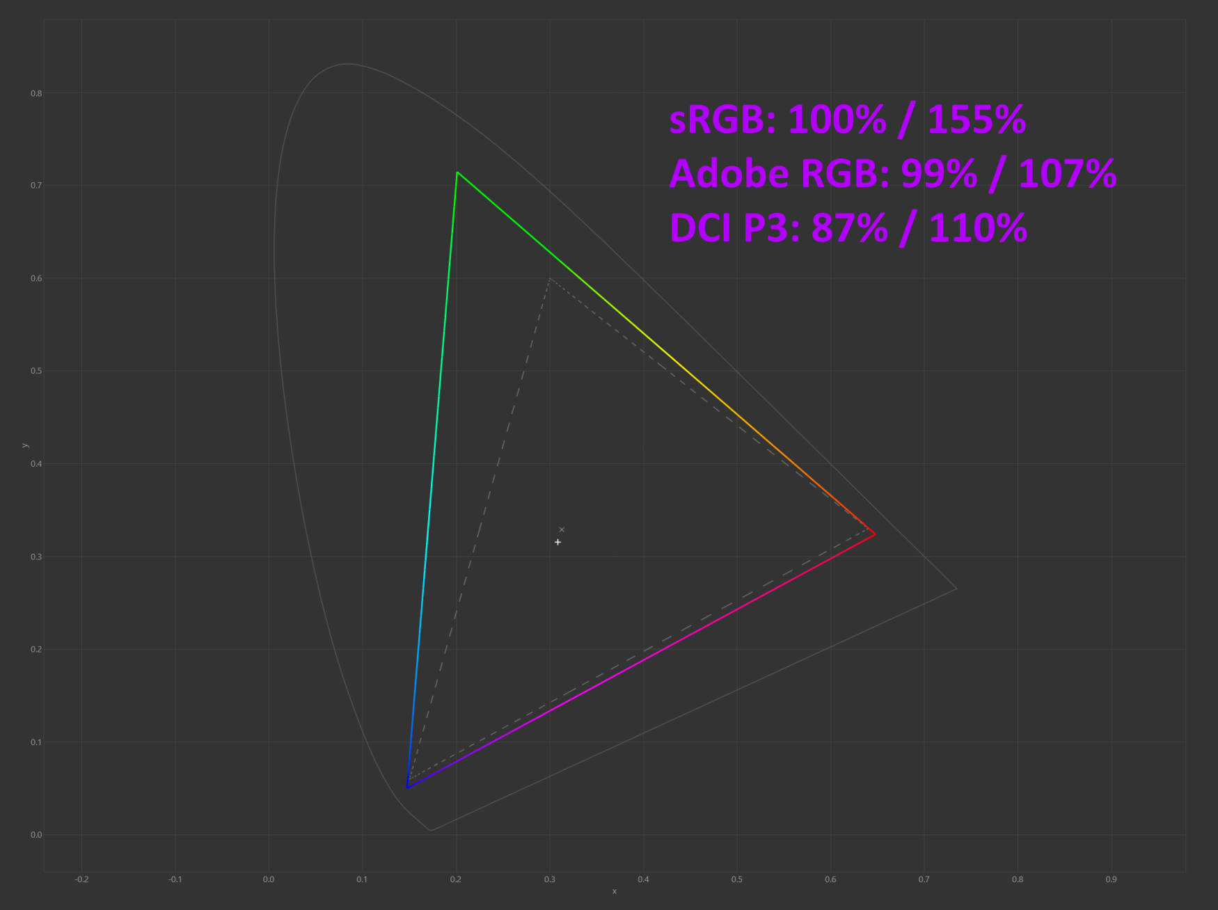 Полные цветовые охваты превышают 100%, в то время как обычные значения для sRGB и Adobe RGB составляют более 99%, а для DCI P3 – 87%.