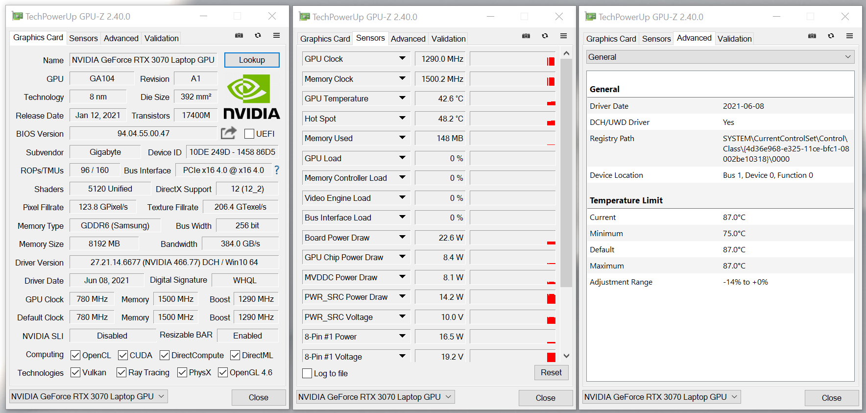 Утилита GPU-Z сообщает, что внутри установлен Max-Q вариант мобильной видеокарты RTX 3070 – память функционирует на эффективной частоте 12000 МГц.