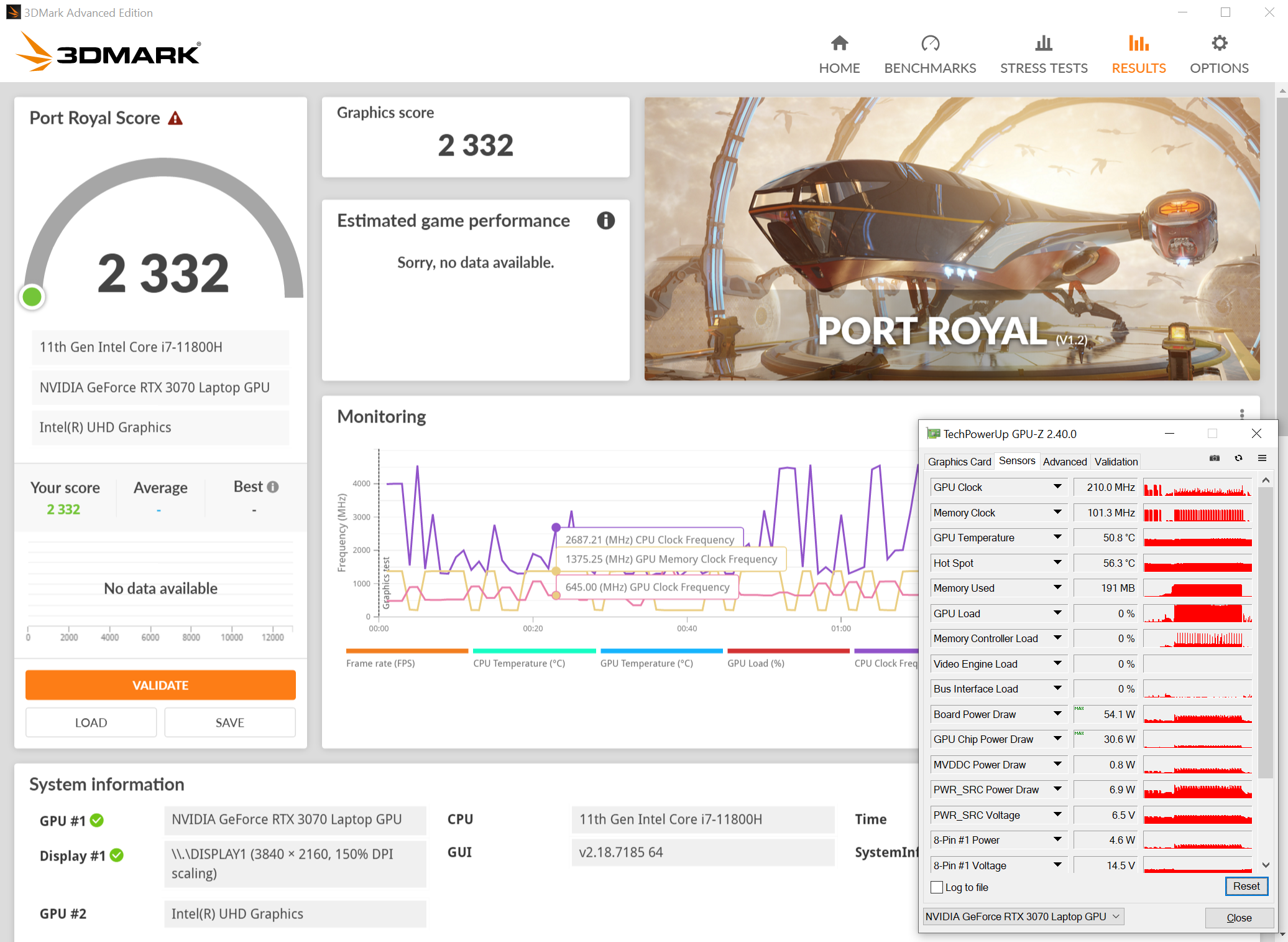 Производительность в некоторых тестах мы представим в двух режимах – при подключённом внешнем блоке питания и при работе от батареи. В бенчмарке 3DMark Port Royal результат практически подобрался к отметке 5300 баллов. Частота графического процессора колеблется в районе 1450 МГц, его энергопотребление ограничено отметкой 67 Вт (энергопотребление видеоподсистемы в целом - до 92 Вт), а частота процессора при необходимости превышает отметку 4.5 ГГц.