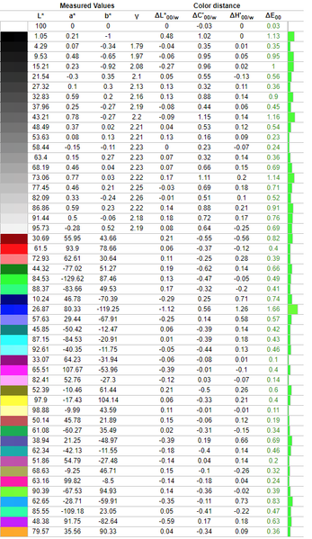 Что касается обещанной заводской калибровки, то это можно полностью подтвердить. Производитель заявляет значение DeltaE <1, что и было получено с большим запасом - всего 0,55 при максимальном 1.66.