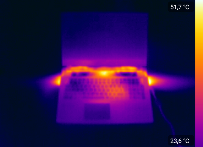 А теперь – обещанные фотографии, сделанные при помощи тепловизора. Конструкция корпуса выполнена таким образом, чтобы в рабочей зоне (сенсорная панель и клавиатура) дискомфорт от высоких температур не наблюдается. Конечно, корпус нагревается, однако никаких явных проблем в ходе продолжительного тестирования выявлено не было.