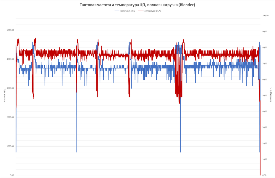 Если же нагрузить процессор, к примеру, визуализацией изображения в blender, то частота будет колебаться в районе 3,6-4 ГГц, а температура сначала поднимется до 85 градусов, но затем опустится (вспоминаем ограничения по энергопотреблению) примерно до 75 градусов.