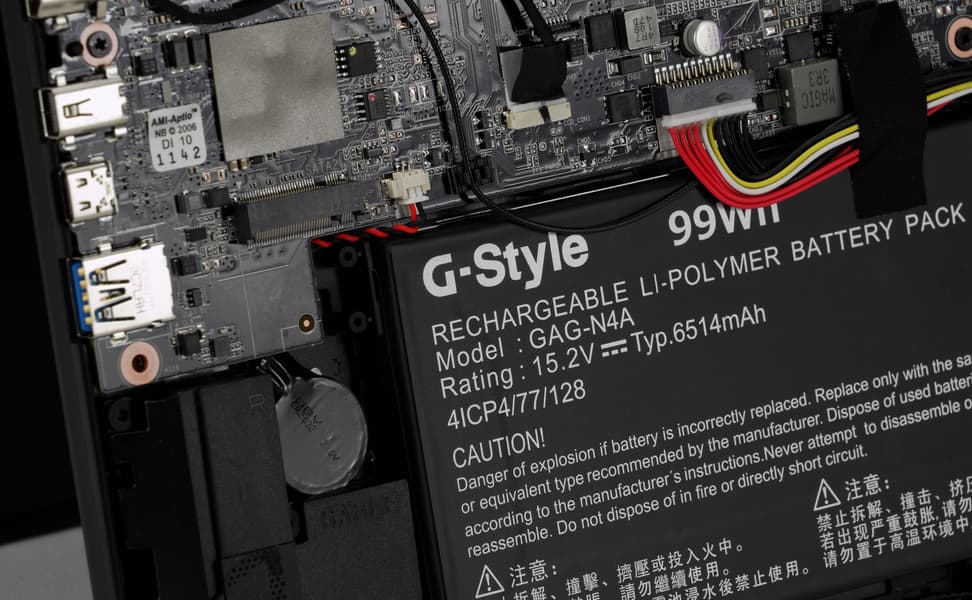 Разъём для установки второго накопителя расположен совершенно в другой части корпуса. Ёмкость батареи составляет 99 Вт ч, что даже несколько выше, чем у аналогичных по характеристикам ноутбуков конкурентов. Производитель заявляет до 8 часов автономной работы, однако это характеристика справедлива, в частности, для режима – просмотр видео в формате FullHD при 20% яркости дисплея, с отключённым модулем беспроводной связи и в режиме максимального энергосбережения. К автономной работе мы ещё вернёмся.