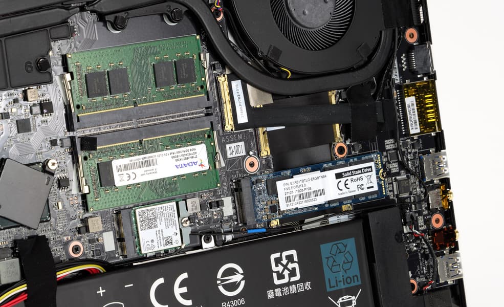 Оперативная память представлена набором из двух 16 ГБ модулей, функционирующих на частоте 3200 МГц. Рядом с модулями ОЗУ установлен модуль беспроводной связи Intel AX200NGW. Чуть правее нашлось место для одного M.2 NVMe PCIe SSD-накопителя.