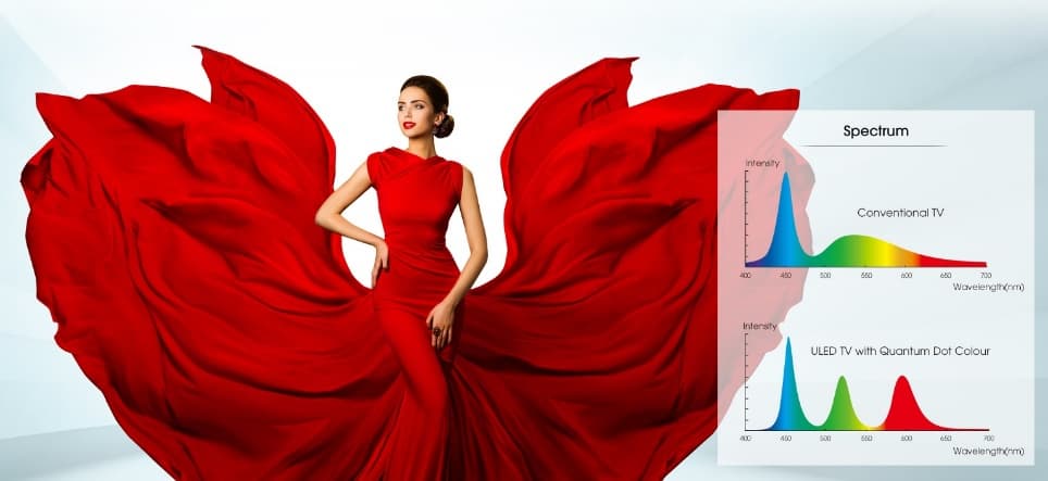 Таким образом получается спектрально более чистый белый свет, который позволяет расширить точность цветопередачи и диапазон отображаемых цветов, обеспечивая полное соответствие стандарту DCI-P3 (цветовому пространству современных цифровых кинотеатров).