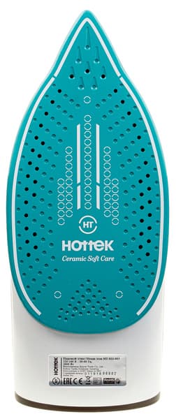 Со стороны подошвы прикреплена наклейка с краткой технической информацией об изделии. Сама подошва обработана керамическим покрытием яркого бирюзового цвета. Покрытие нанесено ровно, поверхность гладкая. Форма подошвы стандартная со скругленными углами и зауженной вершиной. Отверстия выхода пара расположены вдоль боковых граней подошвы и в ее верхней части. На поверхности нанесен рисунок и имеются выемки, в основном, круглой формы.