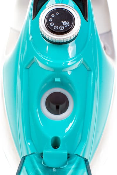 Элементы управления, расположенные в этой части утюга, стандартны: кнопки парового удара и разбрызгивания, регулятор мощности подачи пара; ближе к носику видны откидная крышка резервуара для воды и сопло разбрызгивателя. Крышка открывается без усилий, закрывается с легким щелчком. Диаметр отверстия для заполнения резервуара водой — 1,4 см. По окружности отверстие уплотнено силиконовой прокладкой.