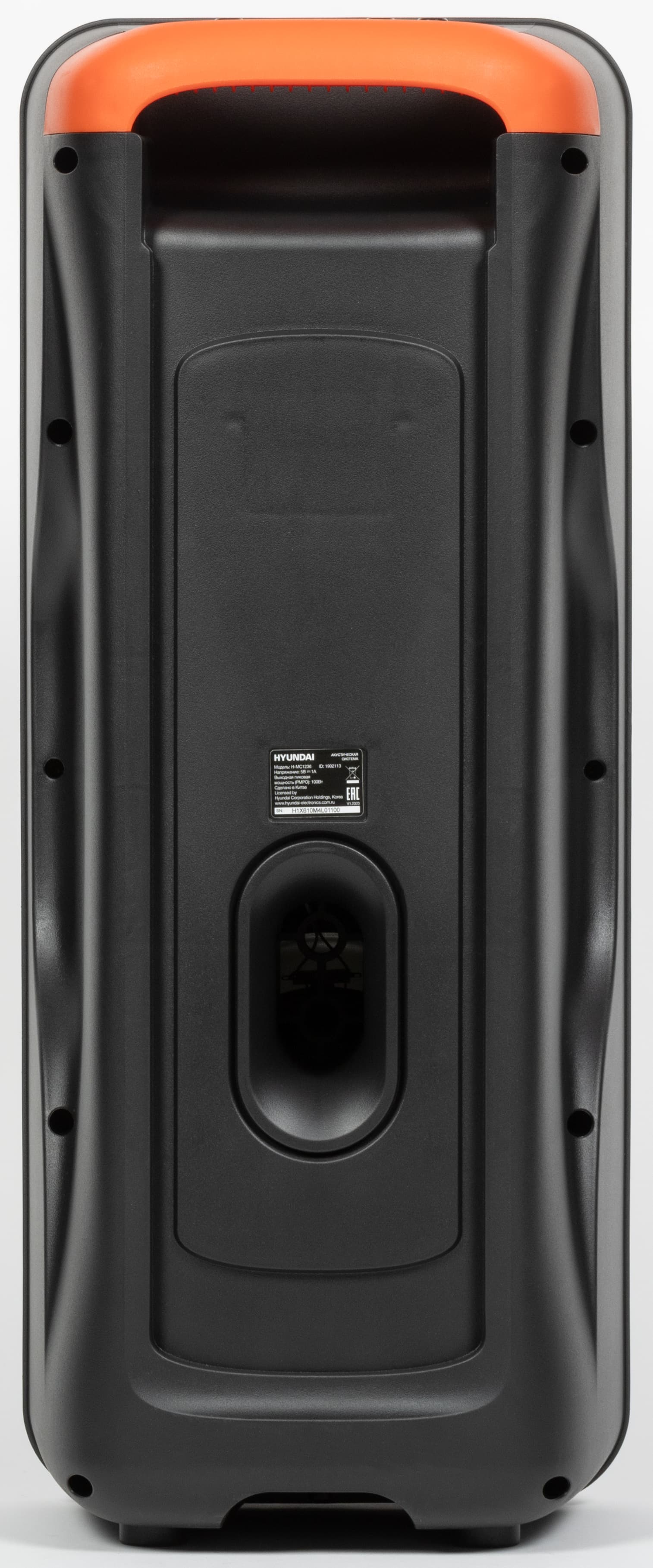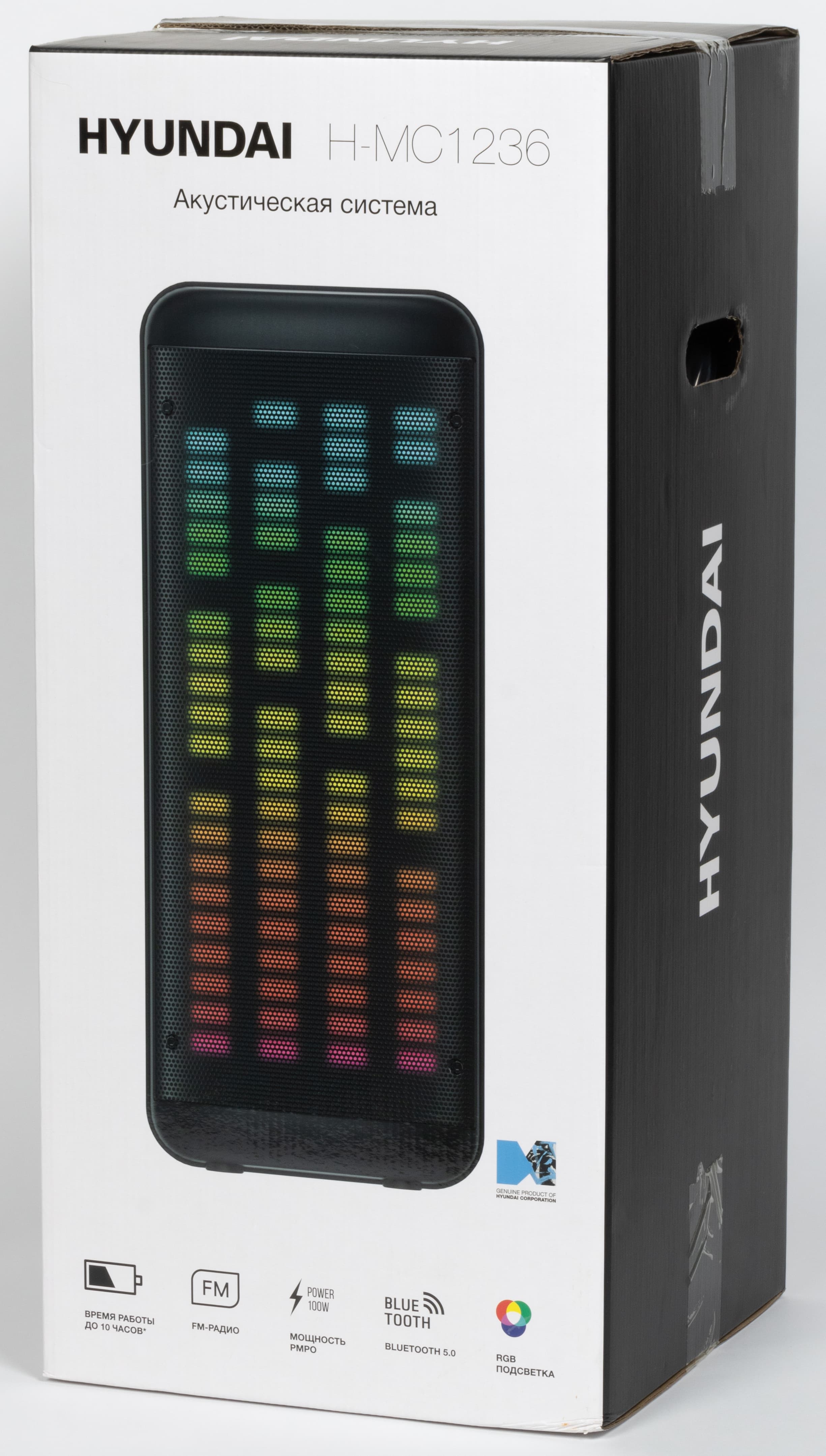 Поставляется Hyundai H-MC1236 в коробке из плотного картона, на которую нанесены изображение устройства и его краткие характеристики. Внутри колонка удерживается с помощью пенопластовых ложементов.
